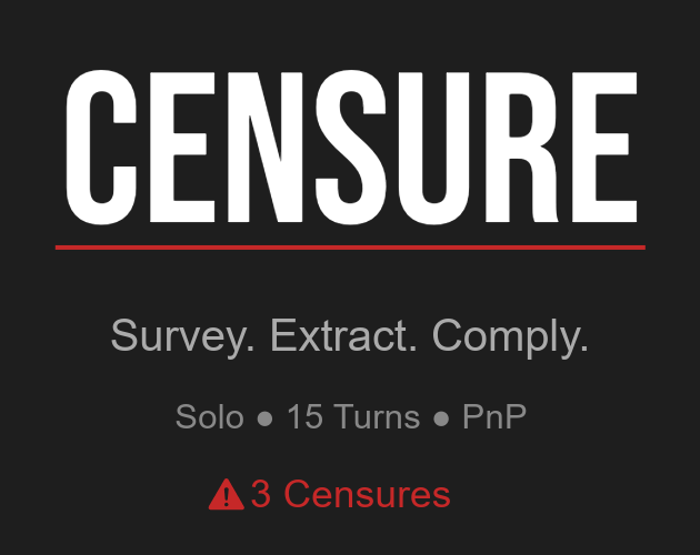 CENSURE is a solo dice-and-resource management game about survival in a corporate dystopia. You're a System Administrator overseeing six Extraction Concessions—rocky worlds, ice fields, gas giants, asteroid belts. Each turn, Events threaten your operation. Each quota gets harder. Each Censure brings you closer to reassignment.